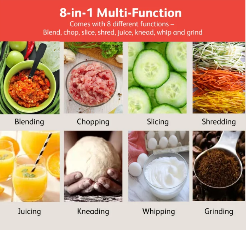 Blending, Chopping, Slicing, Shredding, Juicing, Kneading, Whipping & Grinding